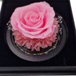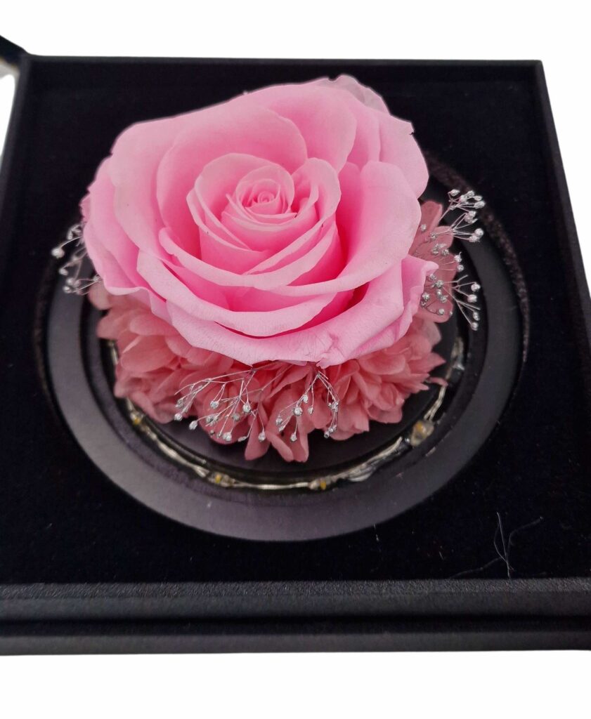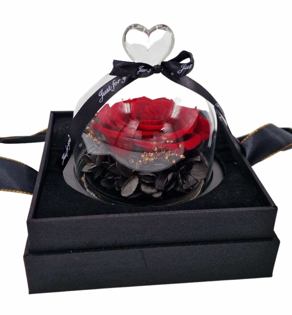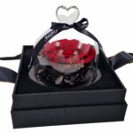 Dehidrirana ruža u zvonu sa sijalicama. Dekorisana sitnim zlatnim detaljima i crnim lišćem za dodatnu dubinu i kontrast.Ukoliko u ponudi tražite poklon koji traje večno to je upravo dehidrirana ruža sa sijalicama.